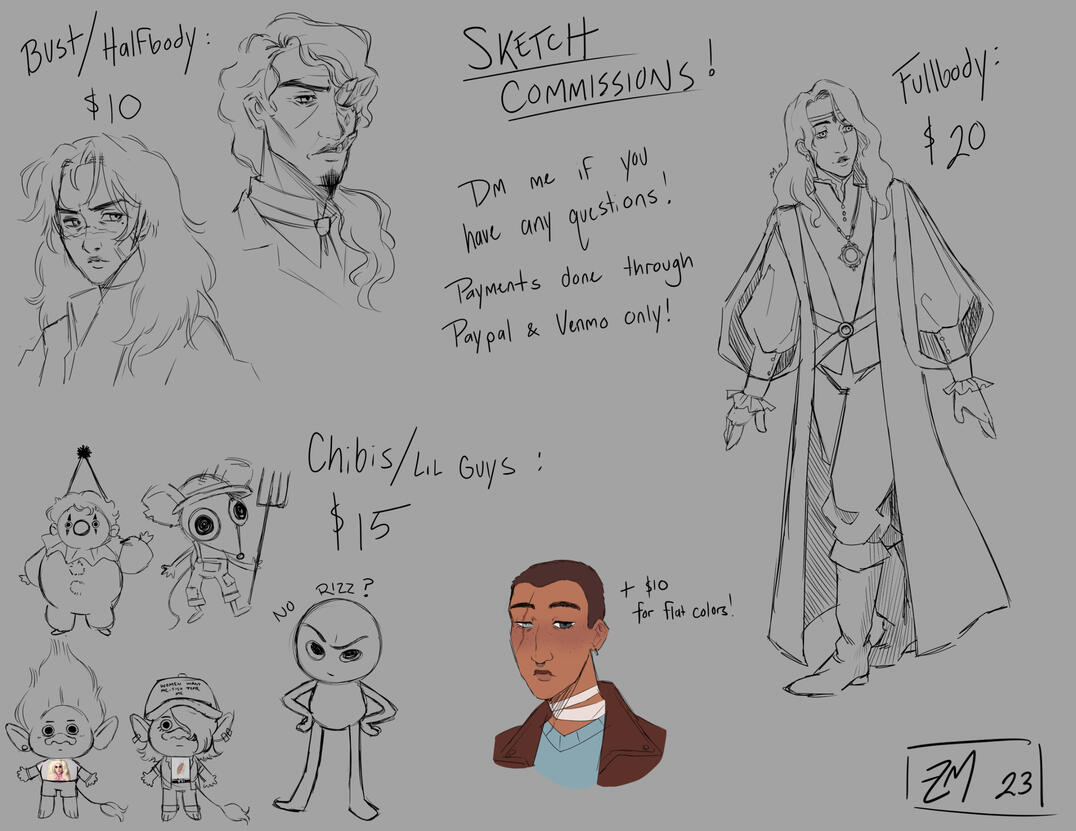 Please take a look at my terms of service, as well as my commission wills and won'ts before commissioning meDo NOT claim any artwork that I make for you as your own work!Please tag me on any post that you make on social media. (socials are on Contact page) I wanna make sure I am able to like your post and share it.If posted anywhere else please leave proper credit and leave a link to one of my socials or this website.Do NOT remove or cover my watermarks or signature on art pieces that you receive from me. All Commissions will have a signature along the lineart and a watermark signature hidden in the piece itself.IF YOU WOULD LIKE A COPY OF YOUR PIECE WITH A LARGER WATERMARK PLEASE TELL ME. This would help in art theft when a piece is posted somewhere.If there is an issue or mistake in your finished commission, please inform me. Most mistakes can be fixed with no charge. Large changes (such as pose/expression/anatomy changes) that could be caught earlier in the process (during sketch approval) however will cost extra as I will always ask for sketches to be approved for big changes before moving on lines. Depending on the complexity of a character design, the overall price may increaseNOTE ON PAYMENT: